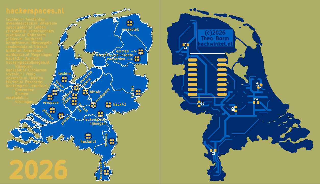 Het gaat om een kaartje van NL (~100 bij 85mm), met daarop alle 18/19 (mij nu bekende) hackerspaces als ws2812b, aangestuurd door een ESP32-c3 die (indien wifi) de space-state kan ophalen en weergeven.