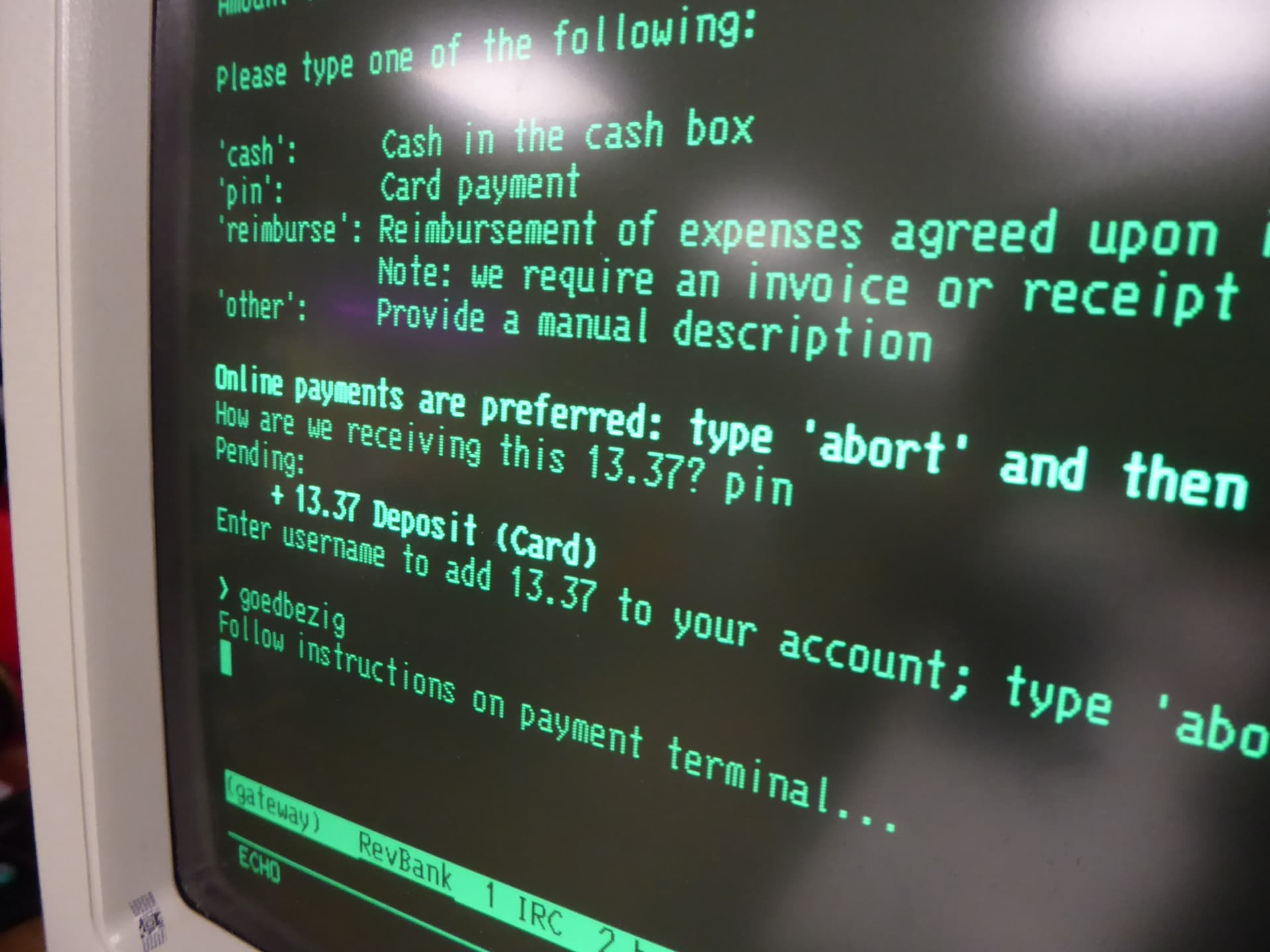 We konden een pinterminal gratis krijgen. Deze was over van WHY2025. Doordat het een wolk-API heeft, was het relatief eenvoudig te integreren met RevBank.