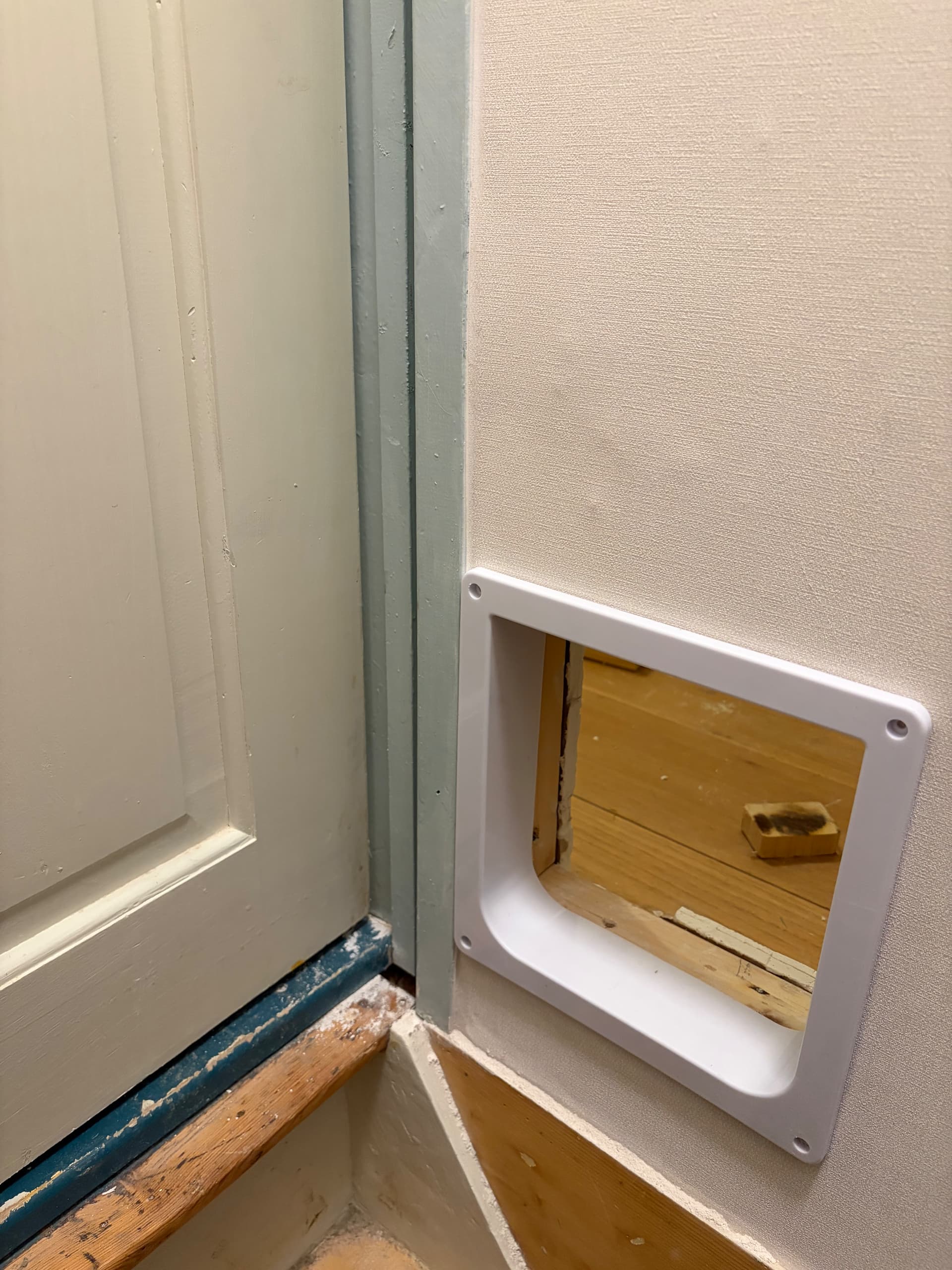De katten hebben hun eigen toegang tot de etage gekregen. Dan kan de grote deur dicht blijven, scheelt stoken. Er komt nog een compleet kattenluik in, die arriveert morgen.