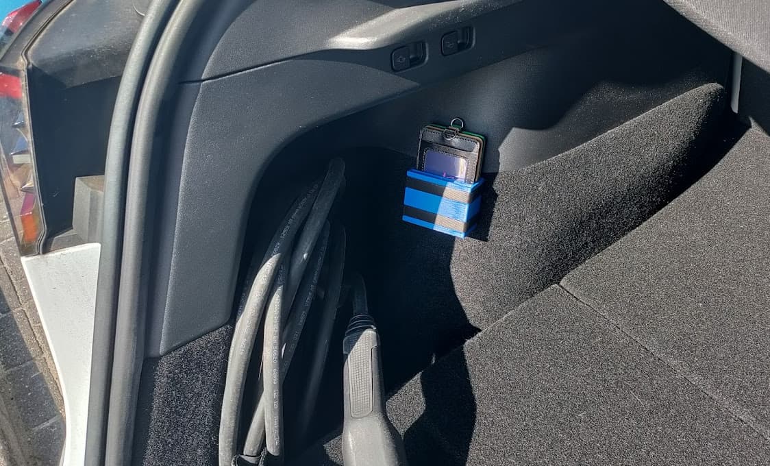 Een nieuwe versie van mijn laadpashouder ontworpen en word nu geprint. De vorige had klittenband erop geplakt, maar dat liet telkens los met warme dagen.
