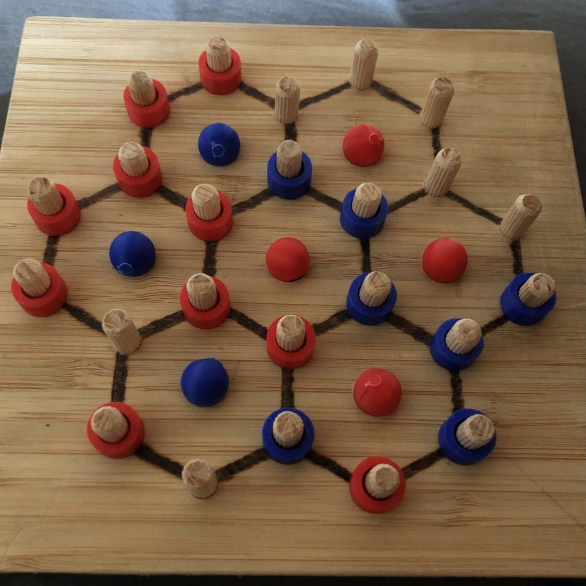 We cut a chunk of left-behind wood (was it part of a cutting board or a kitchen counter), burned the tracks into it, drilled holes with the drill press and inserted wooden pegs and we had the board for Gosix, an abstract strategy game.